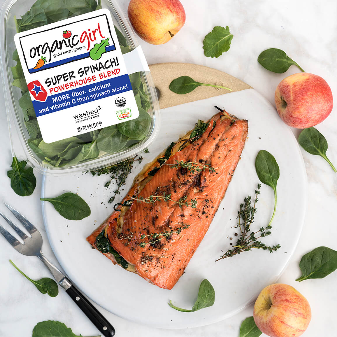 put something new on the table, like this apple & spinach stuffed salmon recipe! you'll love this beautiful and delicious roasted salmon. stuffed with apple and POWERHOUSE SPINACH BLEND and brushed with dijon and maple syrup, the incredible flavors of this stuffed salmon recipe are undeniable. makes a beautiful main dish for your holiday table!