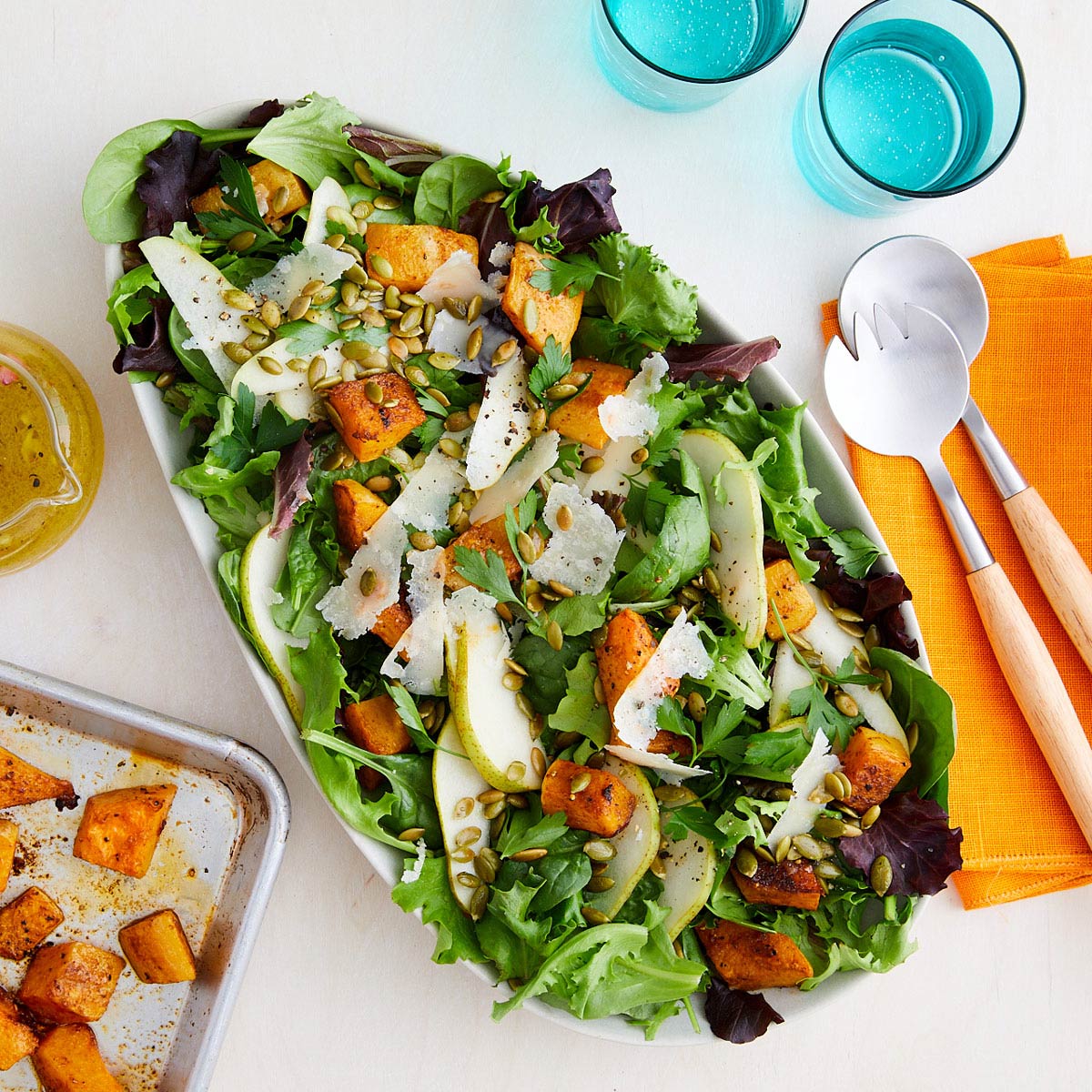 6. in a large salad bowl, combine cooled orzo, roasted squash and chickpeas, baby kale, pickled red onions, crumbled feta, and pumpkin seeds. drizzle with homemade dressing and toss gently to combine.