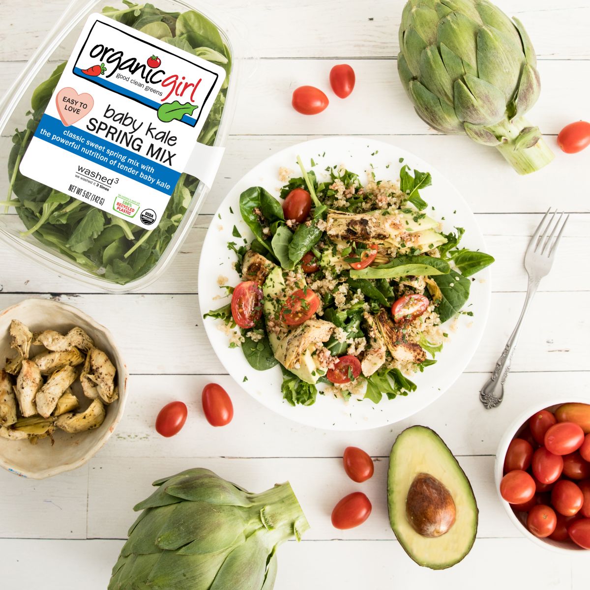 5. toss spring mix plus and quinoa with dressing and divide between plates or bowls. top with artichokes, avocado, and tomatoes.