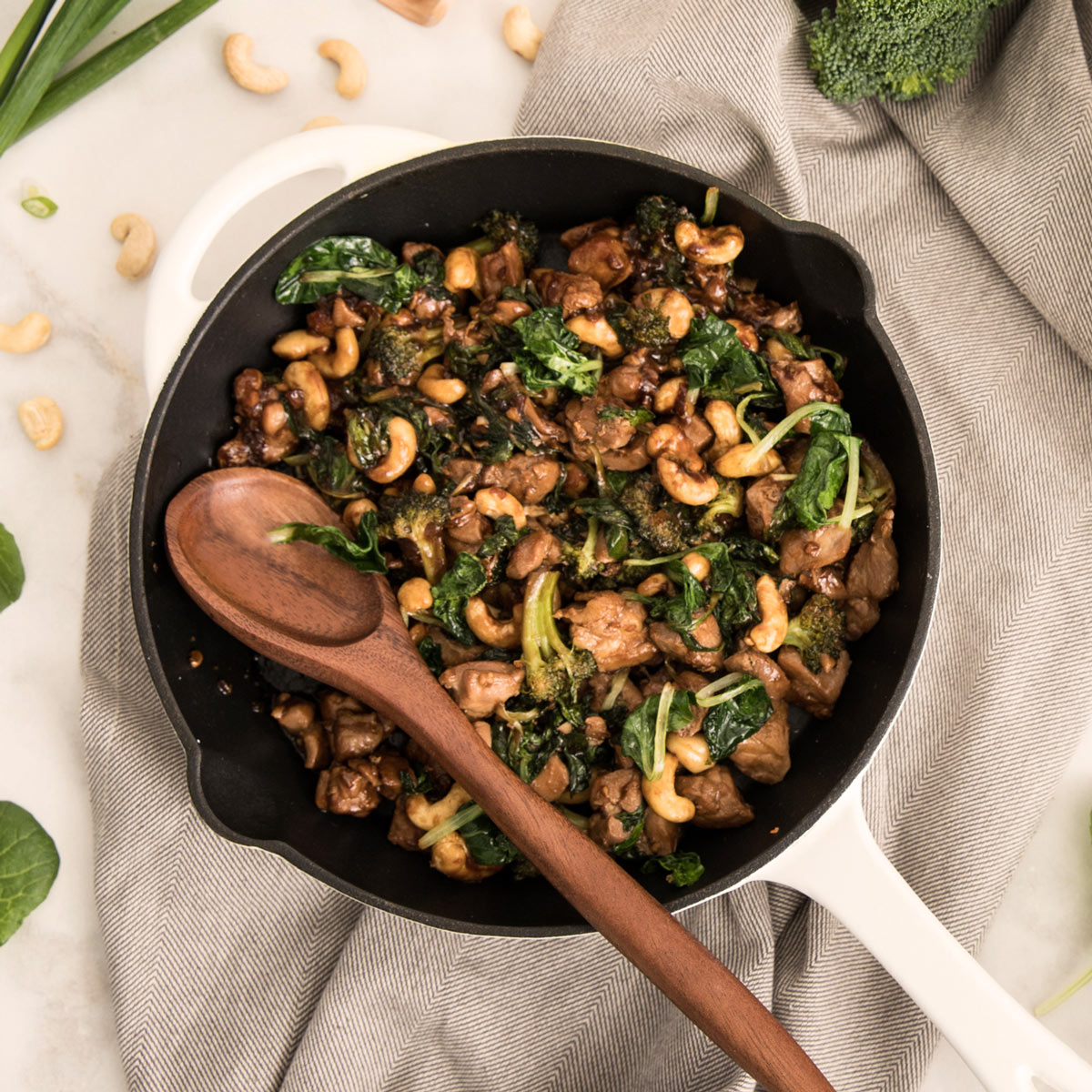 2. in a large skillet, heat oil over medium heat. add mushrooms and garlic and cook, stirring,