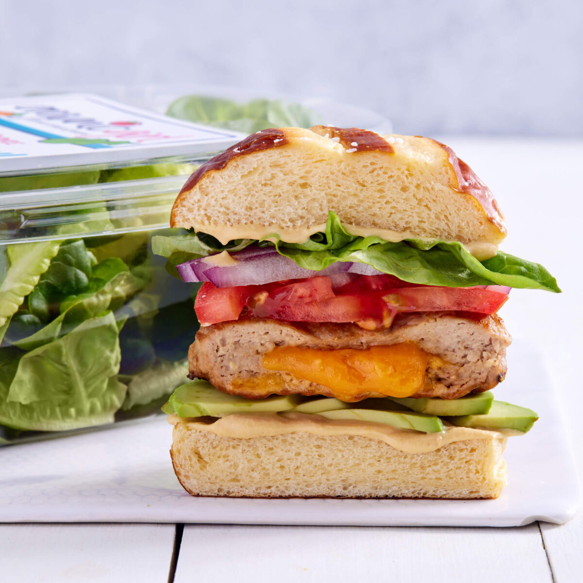 by using lean turkey meat in a classic juicy lucy burger, you reduce your saturated fat and still hold on to that amazing nostalgic flavor. the molten cheese center is creamy and the organicgirlⓇ butter lettuce is crunchy for a perfect balance. this burger is sure to be the talk of your next BBQ!