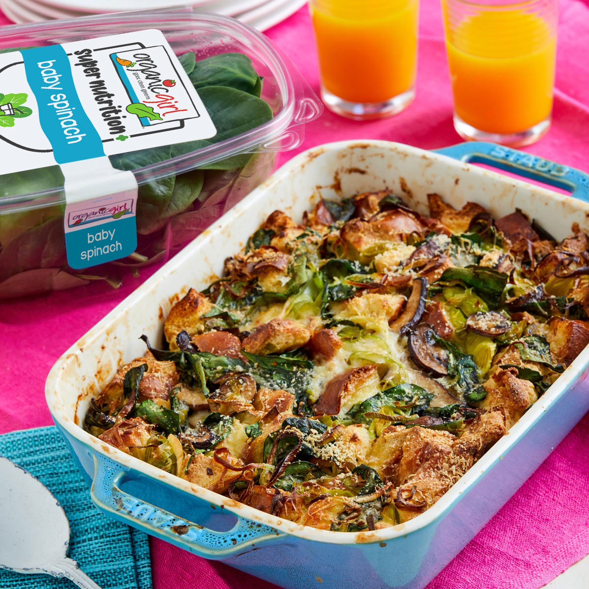 organicgirl baby spinach and a variety of mushrooms are the stars of this breakfast, which is enhanced by fresh leeks and savory herbs. This bread pudding can be completely assembled the night before and baked in time for a hearty breakfast. The smells wafting from the oven will get everyone excited to start the day.