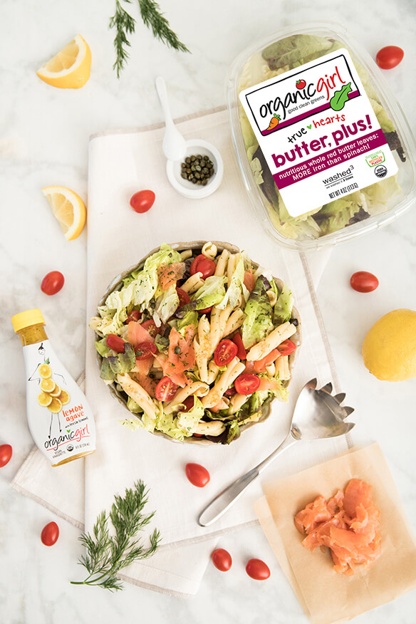 smoked salmon pasta salad with butter, plus! lettuce and capers - iloveorganicgirl