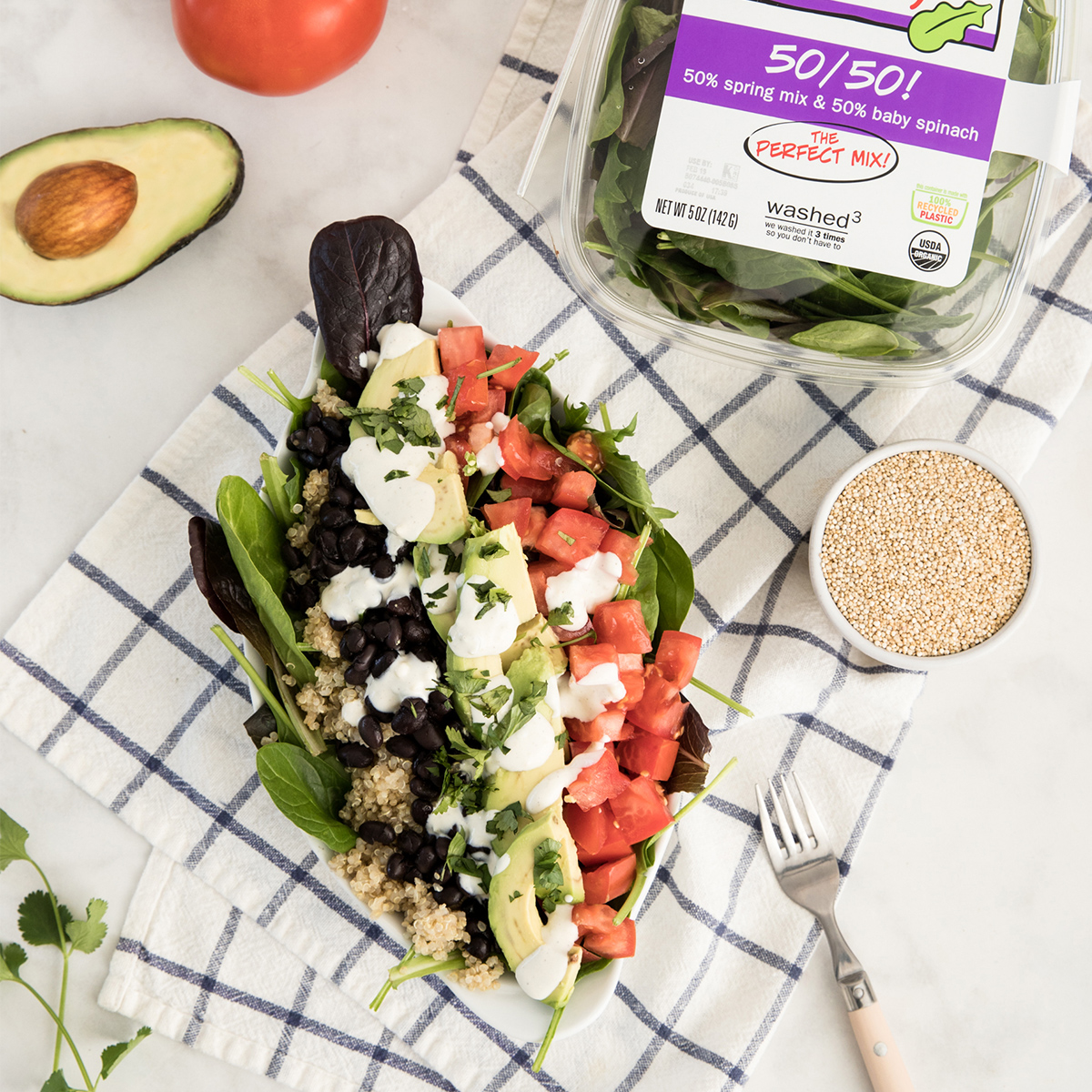add some southwest to your life with this southwest quinoa taco bowl recipe! everyone loves a good taco bowl! this southwest quinoa taco bowl is healthy, hearty and packed with protein. with plenty of our 50/50 greens mix, veggies and hearty quinoa and black beans, this taco bowl recipe is full of flavor but low in calories and fat! great as a flavorful lunch or healthy dinner choice!