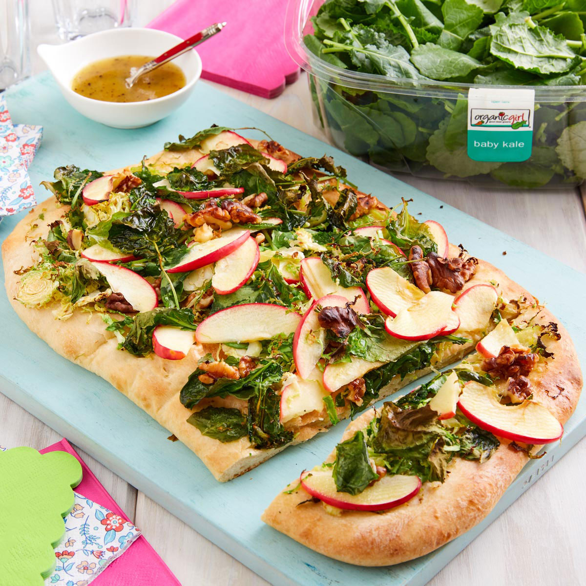 6. divide evenly amongst 4 bowls and top with slices chicken breasts. serve with apple cider vinaigrette